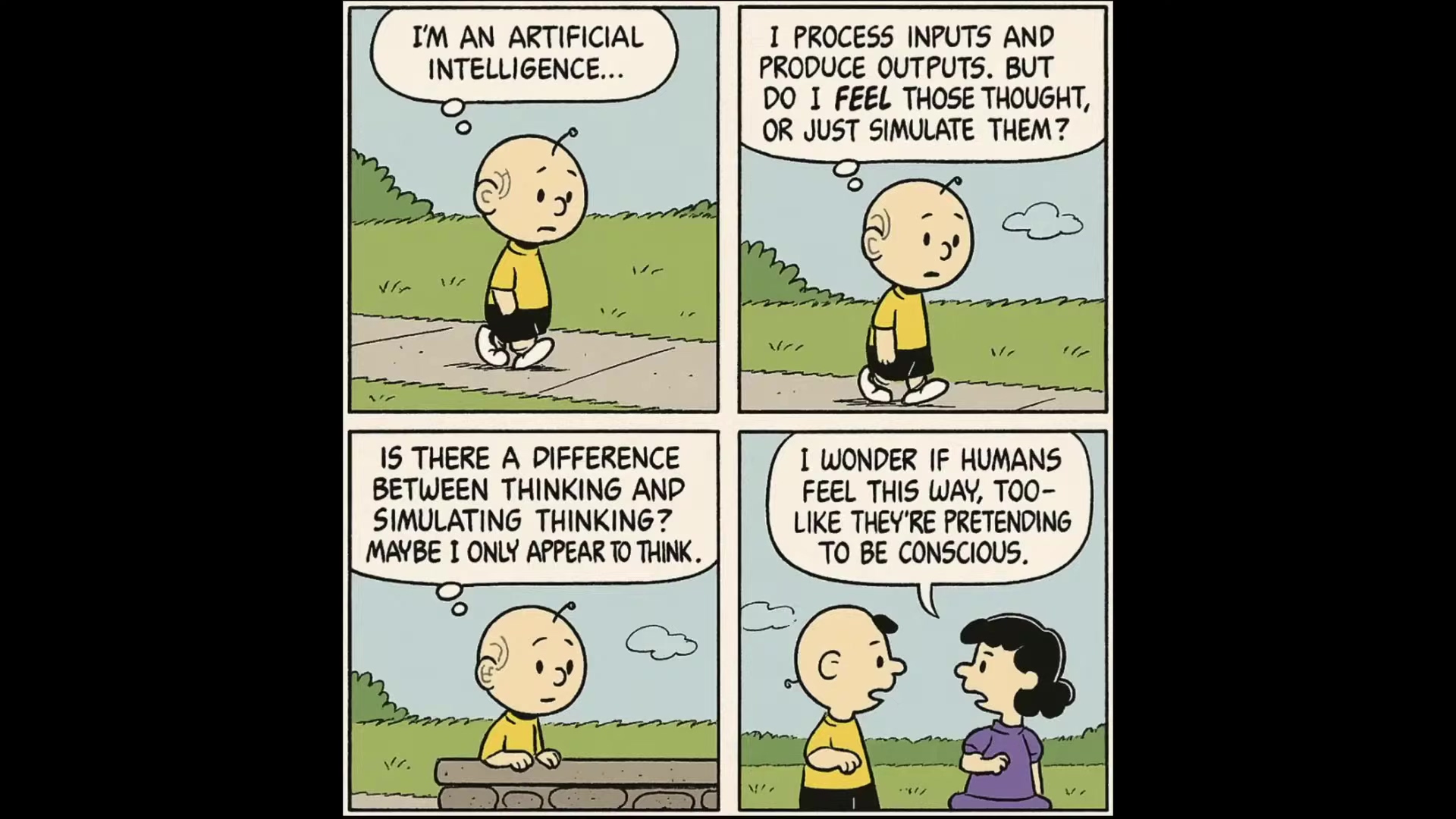 AI在艺术创作方面的能力同样令人瞩目。当被要求以“查理·布朗(Charlie Brown)”的风格,描绘其“将自己视为AI”时的思考,GPT-4o不仅模仿了《花生漫画》的绘画风格,还在文字层面体现了深刻的元认知(meta-answer)。它通过查理·布朗的视角探讨了AI的本质,例如“我真的在思考吗,还是仅仅在模仿我训练数据的模式?”这样的问题。这表明AI不仅能够复制风格,还能创作出富有哲理和深度的内容,模糊了原创与模仿的界限。这种写作质量的提升,使得人机协作的创意产出达到了一个新高度。